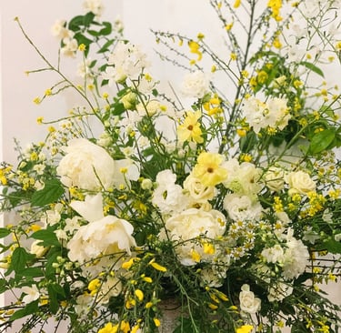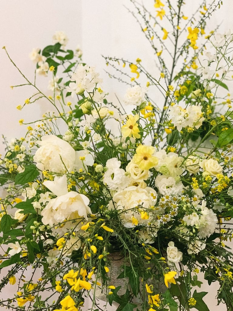 Boda en la Capilla de las Conchas y recepción en el Gran Hotel de la Toja. Decoración floral en blanco y amarillo con peonías, flores silvestres y arreglos naturales estilo ikebana para una celebración elegante y luminosa.