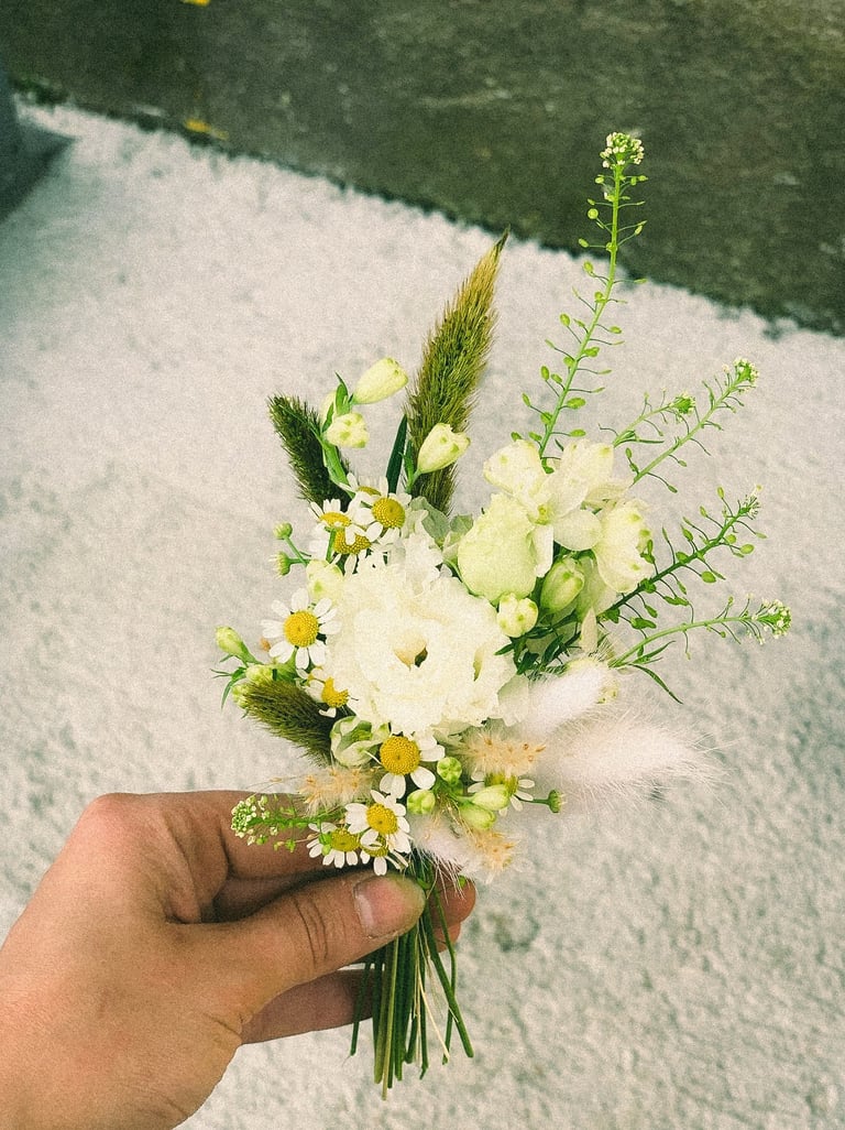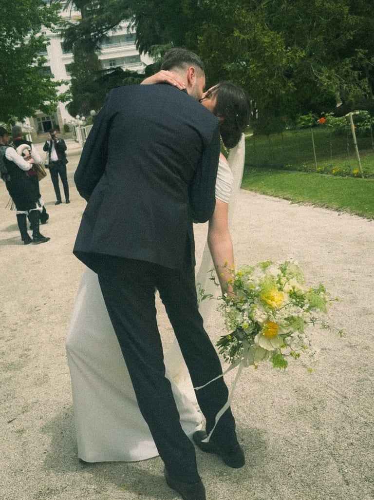 La novia, de una elegancia sencilla y atemporal, llevó un ramo con peonías y flores silvestres en la misma gama de colores. Un diseño suelto, ligero y lleno de textura, pensado para reflejar la alegría de una boda primaveral frente al mar.