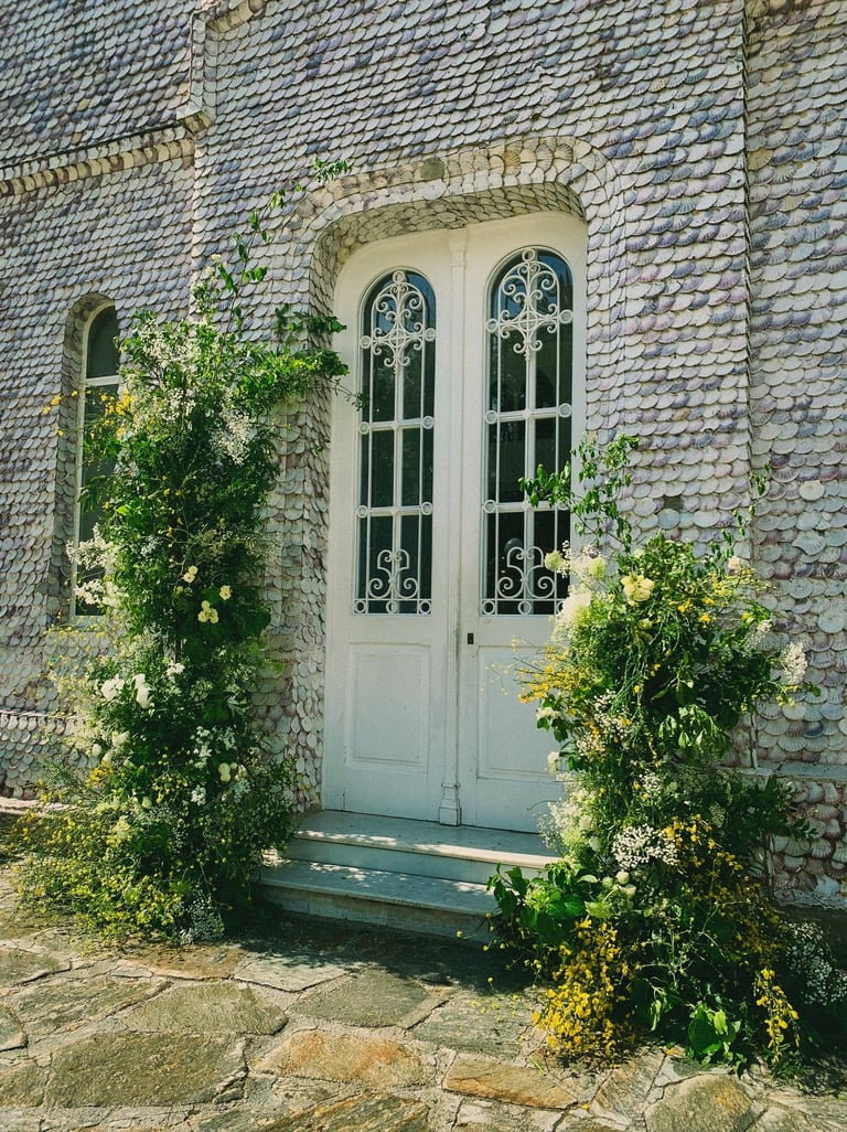La ceremonia tuvo lugar en la preciosa Capilla de las Conchas, un lugar con historia y encanto propio. En la entrada diseñamos dos columnas florales con flores silvestres y peonías, con un aire suelto y orgánico, casi como si hubieran brotado entre las conchas de la fachada. En el interior, el altar se enmarcó con dos arreglos estilo ikebana y pies de virgen, creando un ambiente delicado y luminoso.