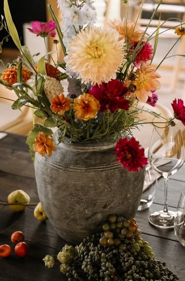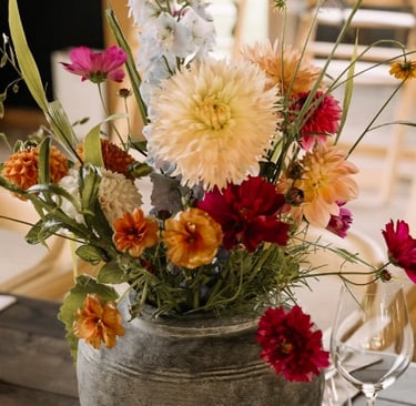 El centro floral corría de extremo a extremo con una estética orgánica y desenfadada: dalias, zinnias, rosas en tonos cálidos, silvestres frescas y follaje en movimiento para imitar la vida del jardín. El resultado fue atrevido, alegre y sofisticado al mismo tiempo —un reflejo perfecto de los novios.