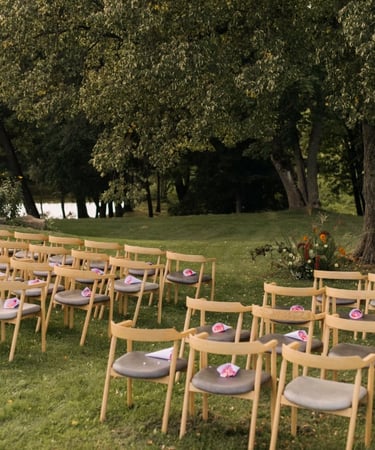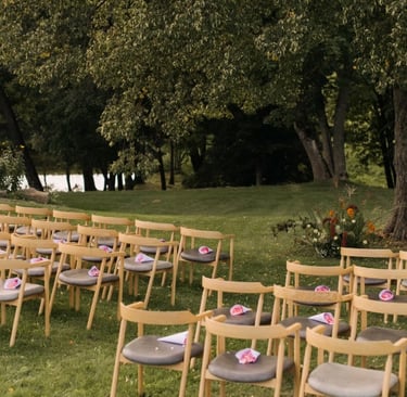 Las sillas orientadas hacia el bosque crearon una atmósfera íntima y muy emocional. No había distracciones: solo ellos, sus votos y la naturaleza abrazando el momento.